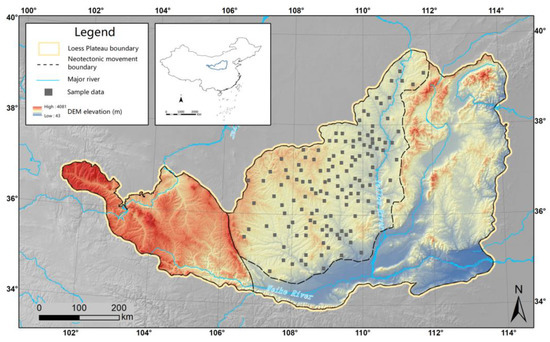 The study and sample areas in this study are shown in Figure 2. The sample area is located northwest of the neotectonic movement zoning line, mainly because this area includes typical loess landforms, such as loess tableland, residual tableland, loess hill, loess ridge and mountain areas [50]. This area also includes some areas with low erosion, such as the sand-covered loess and rocky mountainous areas, which meet the research requirements in terms of topographic typicality and comprehensiveness.