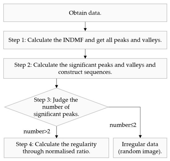 On the basis of the INDMF, this paper proposes the calculation method of the INDMF regularity. In regular or approximately regular texture images, period refers to the step value of the repeated occurrence of texture primitives. Theoretically, the average step value of the directed sequence between peaks obtained by the INDMF should be equal or approximately equal to an integer multiple of the average distance between the texture primitives. However, the gullies of the loess landform show an approximate regular or random texture. If the gullies show an approximate regular texture, the step value difference of the sequence between the peaks calculated by the INDMF is within a certain threshold range. Otherwise, no significant sequence of peak and valley values exists. The flow chart of the calculation method of regularity based on the INDMF proposed in this paper is shown in Figure 3.