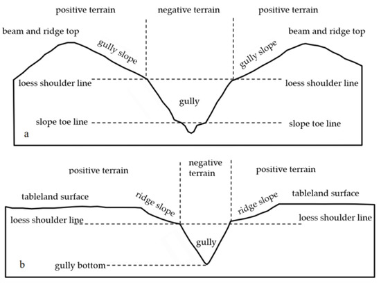 Schematic of the positive and negative topography of the Loess Plateau [55]. (a) loess hilly and gully area; (b) loess tableland area.