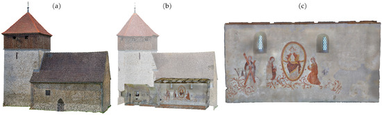 The captured point clouds of the Wehrkirche Döblitz (a) from outside and (b) of the main hall and the sanctuary at the ground level and (c) the reconstructed orthophoto of the wall painting.
