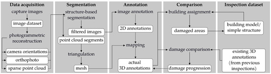 The workflow presented in this case study aims to process the acquired data into a linked 3D dataset. For this purpose, image-based 2D annotations of each data acquisition campaign were mapped to the reconstructed building surface. This enables the resulting 3D geometries to be assigned to the corresponding building elements and the images containing the damage. In a next step, the multitemporal annotations were assigned to those annotations that represent the same damage in a previous state. Based on the assignment, the local damage differences between the states were evaluated. The information from all these steps were integrated into a linked inspection dataset that allows queries and serves as a basis for further analyses or documentation. Figure 2 shows the processing workflow for the actual dataset for each state, including the comparison to previous inspections. The steps of data acquisition and segmentation are explained in Section 2.3 and the processes of annotation and comparison in Section 2.4.