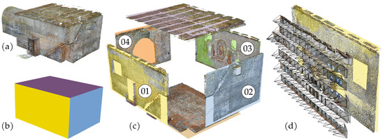 The dataset of the images and point cloud is unstructured at this point and, thus, needs a semantic segmentation to arrange the data for more effective processing, as also presented in Apollonio et al. (2018) [9]. Therefore, a simplified model of the main hall, representing the floor, walls, and roof as facets, was manually modelled. As shown in Figure 3, the facets were used to apply a segmentation of the point cloud to solely include: