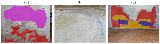 Examples of annotated damages: (a) areas of missing plaster (red) and craquele (purple), (b) a crack polyline (light blue) and a small missing plaster detail as a polygon (red), and (c) the synthetic multitemporal labels for the case study in (blue), (yellow), and (red) for a missing plaster area.