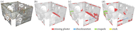 Three-dimensional view of (a) the segmented walls with assigned numbering 01–04 and (b,c) the mapped 3D annotations as coloured decay mapping in the states (b) , (c) , and (d) .
