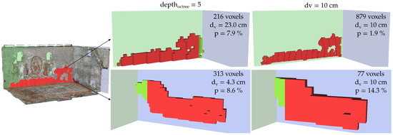 For this purpose, a voxel grid was generated around the assigned damages and evaluated according to the respective timestamps of the surveys. The accuracy of the results depends directly on the accuracy of the registration of the point clouds (or meshes). Since a radius rv must be determined to compensate for the offset, as described in Section 2.4.4, it influences also . The voxel radius rv also helps to shift the discrete geometry more towards a centred position inside the generated voxel representation [33]. This effect does not occur with a rough voxelisation without an applied radius, as shown in Figure 14.