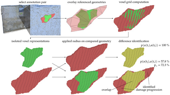 The algorithm for assigning multitemporal 3D damage annotations and of the states and is based on the voxelisation of the geometries [33]. To accelerate the detection of the overlapping AABBs, the geometries arechecked first. Subsequently, a common voxel grid with a defined dv is applied on both geometries and the occupancy of the individual voxels is evaluated. This results in the percentage overlaps and for the percentage of intersection of damage geometry and , respectively. If one of the values is above a defined pmin, the assignment is valid. To compensate the mentioned offset among datasets of different states, an integer voxel radius (rv) is additionally applied, which co-occupies a defined number of neighbouring voxels of a geometry. Figure 8 illustrates the steps of the algorithm with the exemplary damage from the case study dataset.