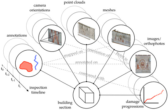 Inspection data that are acquired periodically from the same object in addition allow for the comparison of different states. Chiabrando et al. (2017) [25] applied such multitemporal comparative processing to identify post-earthquake damages of a church building in point cloud datasets of different states. Another example can be found from the identification of significant structural deformation of bridge piers due to temperature effects presented in Hallermann et al. (2018) [26]. In Vetrivel et al. (2016) [27], a voxel-based method for the comparison of pre- and post-earthquake point clouds led to the identification of damaged areas. The application of voxel-based methods enables the development of algorithms that are not based on a specific type of geometry, as also shown for typology analysis in Borrmann and Rank (2009) [28]. However, these studies investigated the identification of damages or deformation in multitemporal datasets, but did not compare the damage entities themselves. Three-dimensional annotations, as shown in the literature, independent of the identification method (e.g., manual, image, or point cloud segmentation) from different states, geometrically serve as a basis to identify localised changes of decays and possibly a derivation of damage progression.