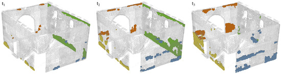 It is possible to replace the mapping or the generation of 3D annotation geometries in this workflow by alternative methods. One other solution could be the mapping of image pixels based on their relative positions to the known salient points of the sparse point cloud, as proposed in Hamdan et al. (2021) [32]. This method uses the pixel-topoint correspondences from the bundler file instead of a ray casting. A similar method was proposed by Manuel et al. (2014) [4], which utilises correspondences from image-based depth maps to segment a damage point cloud from annotated polygons. For visual issues, a model of an already performed photogrammetric reconstruction could also be retextured with a set of pseudo-coloured images according to annotations to consequently keep the labelled damage categories as colours on its surface, as shown in Adamopoulos and Rinaudo (2021) [14]. However, the most direct approach to produce 3D damage geometries is the annotation on 3D models [9,13,15]. Figure 6 presents the results of the mapping process applied to the case study dataset for the main hall, where the 3D damage annotations of the three different states are shown separately. In addition to the increase of damaged regions, it can be seen that some annotations from disappear in due to restoration works on Wall 03.