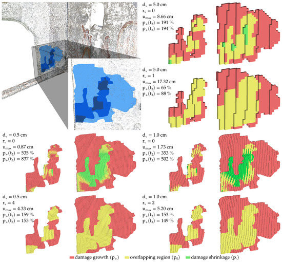 The result of the voxel-based comparison for an assigned set of damages is shown in Figure 8 along with the identification of the localised damage progression. The growth of the same damage among two compared states is expressed as the percentage of detected difference voxels. Thereby, stands for a growth since the previous inspection, since for a shrinkage and for the overlap of the compared damage geometries. Here, due to a better discretisation of the geometry, the accuracy of the percentage value increases with smaller dv, but the computational effort increases at the same time. The percentages of growth and shrinkage enable an automated categorisation or evaluation of the damages. This could also lead to a rating of the damages based on the type of damage, the identified affected building elements, the location on the building element, and the computed damage progression.