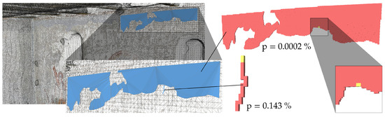 As previously explained, the case study used a dataset of a single data acquisition and additional synthetic data. Therefore, a random shift of maximum was applied on each vertex of the triangle meshes to simulate the inaccuracies and deformation in multitemporal inspection data. The dataset was further processed with and and a threshold . In Figure 12, the effect of a too small rv can be observed as a detection of damage shrinkage in regions with a larger offset due to deformation or a less accurate registration. It also strongly affects the determined percentage of damage growth from the voxel evaluation. Thus, the product of dv and rv from the chosen parameter settings should exceed the absolute value of the expected offset. For the presented case study, needs to be considered.