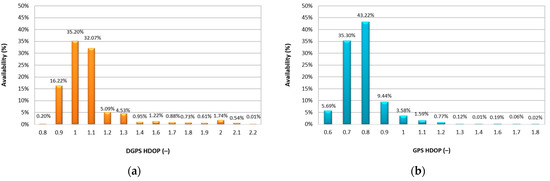 The first element of the DGPS statistical data analysis was to assess the HDOP values noted during the measurements. Figure 5a presents the percentage availability of individual HDOP values for the maritime DGPS system. This variable takes on values ranging from 0.9 to 2.2. From a research perspective, it is interesting to compare the HDOP values for the DGPS and GPS systems. This is why Figure 5b presents analogous GPS statistics, which were analysed in detail in [8]. The comparison of two graphs is not coincidental, because it will enable the drawing of additional conclusions concerning the statistical features of specific variables in the DGPS system as compared to the GPS system.