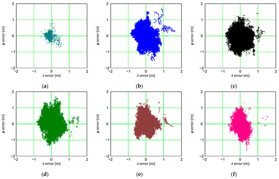 The distributions of the DGPS system’s errors containing the same HDOP value: 0.8 (a), 0.9 (b), 1.0 (c), 1.1 (d), 1.2 (e), and 1.3 (f).