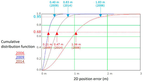 The results of the DGPS system’s accuracy were compared with the studies carried out based on the same station, the same receiver, and under the same conditions. Figure 8 presents the results of these campaigns from the years 2006, 2009, and 2014, during which very long measurement campaigns of approx. 1–3 million fixes were carried out as well [40].