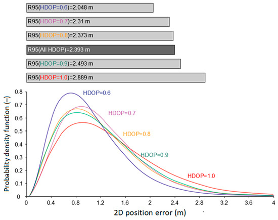 The DGPS system’s accuracy (Y axis) as a function of the HDOP value at a varying probability (X axis).