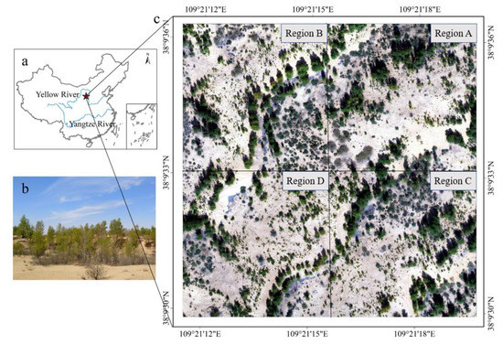 (a) Location, (b) photograph of the study area, and (c) the UAV orthographic mosaic image of the study area and four sub-regions (Regions A, B, C, and D were used as alternative location samples and did not intersect).