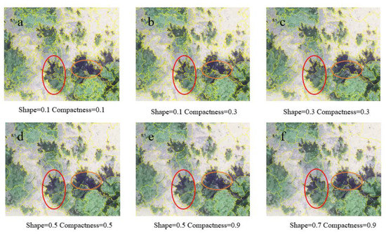 The object-oriented classification was based on image segmentation, in which image elements of the same object are given the same attribute meaning after segmentation. The principle of multi-resolution segmentation (MRS) is to quantitatively evaluate intra- and inter-object heterogeneity via bottom-up traversal and merging from a single pixel, and then to fully optimize the image to aggregate the elements at different scales [32]. MRS consists of three core parameters: scale parameter (SP), shape, and compactness. SP determines the maximum overall heterogeneity allowed for the resulting object and can vary the size of the image segmentation object; it is the most important parameter in MRS and has a large impact on the classification accuracy. The shape defines the size of the structural contrast between the uniformity of the shape and the uniformity of the spectral value. The compactness is used to optimize the tightness or smoothness of the structural contrast of the object in the image. The results obtained using different segmentation parameters are shown in Figure 3.