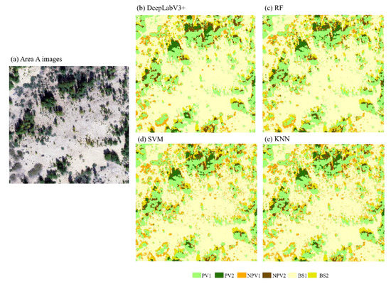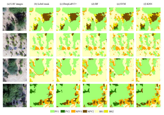 A detailed comparison of the semantic segmentation results for DeepLabV3+, RF, SVM, and KNN is shown in Figure 8. The results show that DeepLabV3+ outperforms RF, SVM, and KNN; it not only better retains the detailed information for various types of object and obtains the subsumed feature edges, but also accurately estimates the sandy land classes (in particular, it can distinguish between PV2 and NPV2 under shading conditions), reduces the confusion between NPV1 and NPV2, and renders the overall estimation more comprehensive. The RF and SVM segmentation results are slightly lower than those of KNN; all methods perform poorly in this region, with a large number of misclassified objects under shadow conditions and poor differentiation between similar objects.