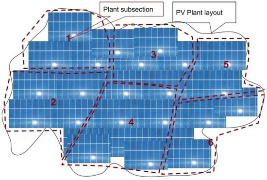 Solar PV energy depends on multiple factors, primarily geographic location and atmospheric conditions. These factors were further classified into and analyzed as spatial and temporal distributions. The spatial analysis consisted of plant size, weather phenomena, panel distribution, panel orientation, facing direction, Sun tracing, etc. Furthermore, the temporal analysis depends on weather disturbance and the seasons, months, days, and hours of the years []. The careful investigation of these spatial and temporal data can enhance the accuracy of the prediction []. We included solar irradiance and power generation data to forecast 2 h solar energy production. The collected raw dataset contains solar irradiance and the power generation time series from 00:00H, 1 March 2020, to 24:00H, 31 March 2021, from Southern India. The solar power generation consists of spatial and temporal components at 5 min intervals and 22 random locations of the plants, as depicted in Figure 1. Figure 1 is the general layout of the studied solar farm to show the sub-distribution of the panels and data collection regions. Our plant capacity is 80 MW, consists of 2.5 million modules, and covers an area of almost 1.2 km2. Our aim was to elaborate the plant for better accuracy. Of course, we can increase the number of observation points, as well as the plants, but we had limitations. The units for solar energy are presented in kWh and MWh. The Gramian cloud field (GCF) matrix [] is proposed to convert solar temporal series to spatial image matrices, which comprised the input data framework of the DNN model.
