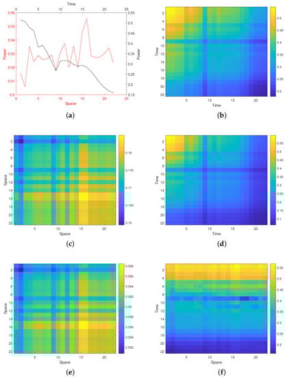 Regarding the GCF image matrix conversion, the matrix’s row and column are the 22 locations (every 5 min) of solar power in the space and time domains. Therefore, n and m in the GCF matrix represent the 22 locations. An example of the GCF image formation based on the available spatial–temporal solar data is shown in Figure 2a; the spatial distributions of the normalized solar power of the 22 locations are shown in the bottom x-axis (space label) versus solar power in the left y-axis, similar to the time domain distribution of the previous 22 values shown in the top x-axis (time label) versus solar power in the right y-axis. In Figure 2a, the spatial data (red line) illustrate the values of a certain point in time, and temporal data (black line) are for a certain location. The image in Figure 2b,c is derived from the GM in Equation (1). The GCF image matrix is derived from Equation (4), and the proposed combination of multiple space and time correlation matrices is shown in Figure 2d–f to understand the solar power distribution properly in the time and space domains. Figure 2b is an image of the temporal distribution of Figure 2a (black color) of the solar power of the 22 previous temporal values derived from the GM in Equation (1). The row (n) and column (m) of Figure 2b are the time vectors. Figure 2c is also derived from the GM in Equation (1), which is based on the spatial distribution of the solar power at the 22 locations, shown in Figure 2a in red color. The row and column of Figure 2c are the space vectors. The GCF images in Figure 2d,e were derived from Equation (4), keeping the time and space domain values, respectively. Figure 2f represents the spatiotemporal image from Equation (4) of the 22 points’ space and time distributions.