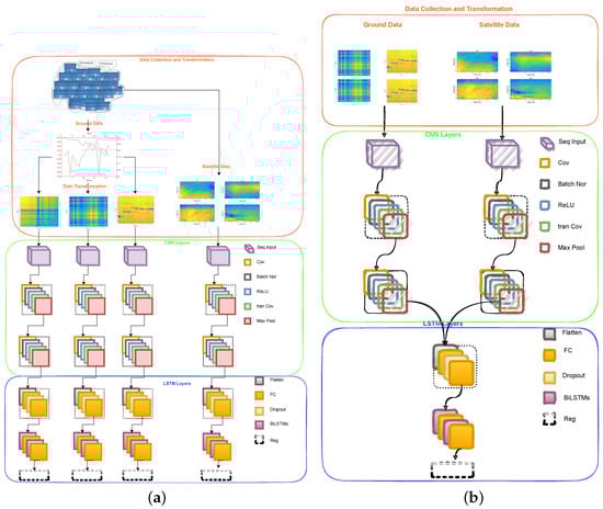 The DNN model networks’ structure with GD, Sat, and Sat-GD data as the input: (a) The framework of the CNN-LSTM model. (b) The framework of the MCNN model.