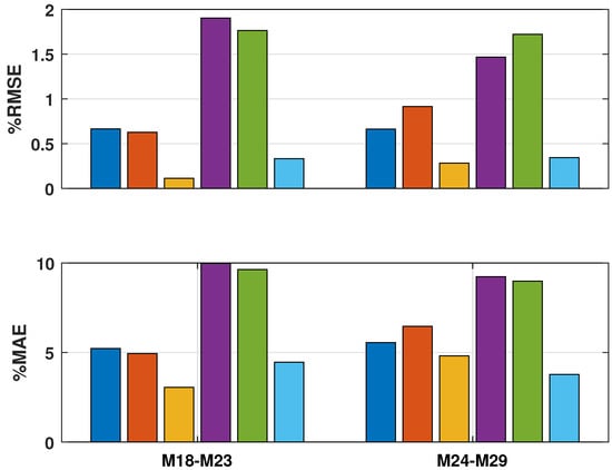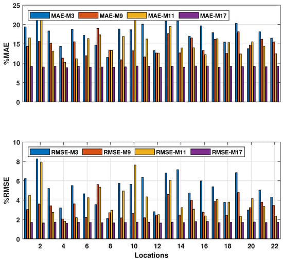 where denotes the RMSE of solar power, is the solar power from the field test, is the predicted solar power from the machine learning algorithm, and N is the number of non-missing data points.