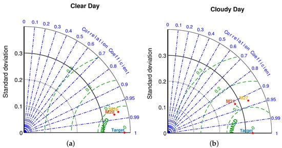 The satellite data’s 4 km spatial and 15 min temporal resolution were different from the ground-measured data, requiring transforming the GCF images. The satellite images benefited the cloud movement tracking for the large-scale spatial analysis. Therefore, the spatial distribution of the image size was considered as km, which is 30-times larger than the actual plant size. The Sun’s movement was considered better with a larger satellite image, around the clock. The cloud shadow variation calculated over the plants was based on the clouds’ altitude (roughly 8 to 20 km) with respect to the horizontal and vertical movements in the sky. In the present study, we used the radiative transfer model (RTM) simulations produced by libRadtran [,] to estimate the solar irradiance. A fast version of RTM was developed by [] based on pre-calculated look-up tables and a replicate for India by []. The major input parameters for the RTM simulations are the aerosol and cloud optical properties, the solar elevation and orientation, the total ozone column, and the columnar water vapor. The outputs of the RTM simulation are the DHI, DNI, GHI, and INS, which cover the wavelength range from 285 to 2700 nm and use the SBDART radiative transfer solver [] with the pseudo-spherical approximation to generate the valid output for solar elevations between 0 and 90 degrees. The model simulation was performed using the band parameterization method based on the correlated-K approximation [], along with aerosol and cloud determination, which were performed based on the default available aerosol models [].