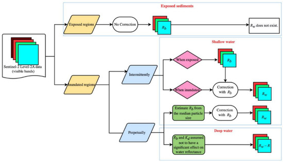 The method will not work well in areas with a very small intertidal range where Rb cannot be measured directly in the shallower waters and used to design a subtidal model. With additional work, it will be possible to develop models based on radiative transfer equations, for example, as provided by software packages such as “Hydrolight”. In the intertidal regions, the errors of the model for estimating Rb for permanently inundated areas originated from the precision of the median particle size extraction and whether the seabed was covered by seagrass. The model was developed using the reflectance of unvegetated exposed pixels because, in our case study, seagrass did not grow subtidally. The existence of subtidal seagrass would create a bias in deeper water; however, the correction becomes quickly unnecessary at these depths. A more sophisticated classification of the sediments may increase the accuracy of the median particle size values used in the regression model. Several machine-learning-based detection techniques (e.g., Ha et al. [22] and Liu et al. [42]) can provide the spatial distribution of vegetation in the exposed regions, which could be used to provide values of Rb for seagrass regions in order to extend our method for use in sites with subtidal seagrass. We also assumed that Rb did not change before and after flooding, an assumption that might also introduce errors because the dry and wet sediments might have different reflectance in each band [44].