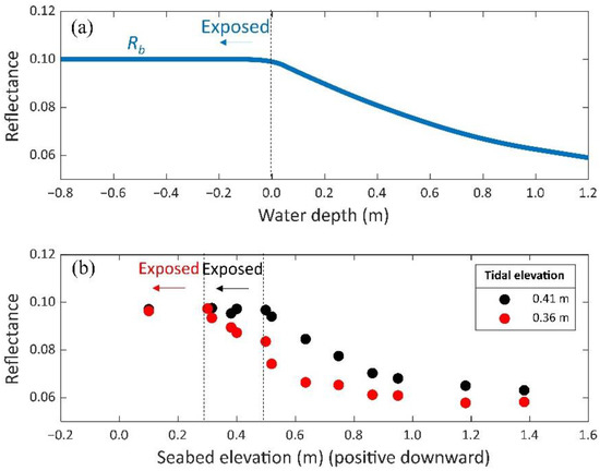 (a) The theoretical dependence of R on water depth according to Equation (1). In this example, Kd was set to 0.5 m−1, Rb was 0.11, Rw was 0.028, and the inundated region was at a water depth greater than 0 m. (b) Examples of the observed reflectance from the transect shown in Figure 1 in Band 2 (blue) plotted against seabed elevation for two different tides (in which the tidal elevation is 0.41 m and 0.36 m below mean sea level).