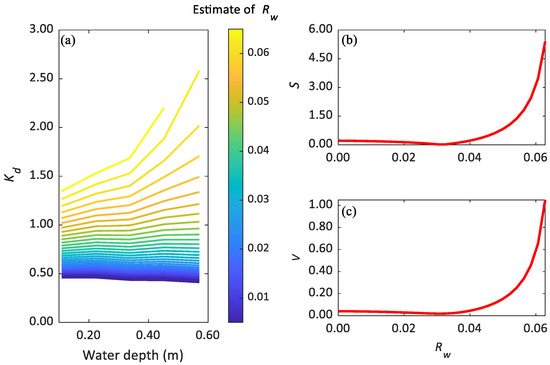 (a) The relationship between Kd (Equation (3)) and z, where each line corresponds to a different estimate of Rw (shown by the colour scale). The depths associated with areas that are exposed or covered by both sediments and vegetation are excluded. (b,c) are respectively the trend (S) and variance (V) of each line plotted in (a). S and V are evaluated over the same range of pixels as shown in (a) and clearly show a defined minimum corresponding to the true value of Rw (0.031 in this example).