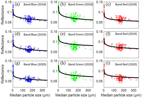 The r2 values and coefficients of the logarithmic regression ( for the blue, green and red bands from 2018 to 2020 (p < 0.05), where d is median particle size (μm).