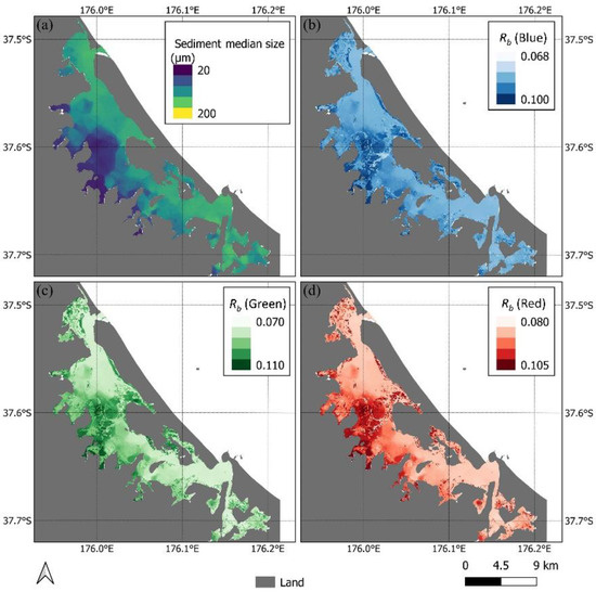 Maps of (a) median particle size derived from the sediment texture maps in Figure 1b–d using the cumulative curve and the estimated Rb (from empirical relationships) in the (b) blue, (c) green and (d) red bands.
