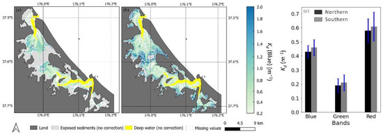 Estimated Kd (Blue) based on the temporal method (applied monthly) (a) and the spatial method (with a 60-m tile size). (b) The images selected corresponding to Figure 8 and Figure 10, respectively. The exact number of images used for each pixel in the temporally corrected map varied due to tidal conditions. (c) The averaged Kd values (±standard deviation) for each visible band derived from shallow water regions after correction in the northern harbour (black) and southern (grey) harbour.