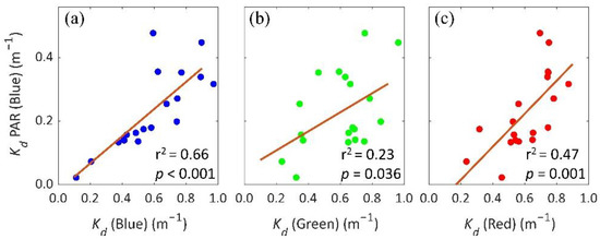 The correlations between Kd (Blue) (a), Kd (Green) (b), Kd (Red) (c) derived from the spatial method (tile size: 60 m) and Kd (PAR) with the r2 values of 0.66, 0.23 and 0.47, respectively (p < 0.05). Kd (PAR) was measured in situ (Flowers et al. in prep.) on 26 February and 12 March 2020, coinciding with a Sentinel-2 overpass.
