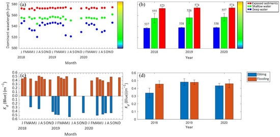 The dominant wavelength of shallow water decreased by ~20 nm after correction using the temporal (applied monthly) method, from yellow (reflecting the influence of the generally sandy bed) to a greener colour (compare Figure 9b,c). The corrected colour of shallow water was close to that of deeper channels near the entrance, where the bottom was assumed not to contribute to water reflectance (Figure 9d). The exposed sediments had fairly homogeneous optical properties with a dominant wavelength of ~570 nm (Figure 9a).