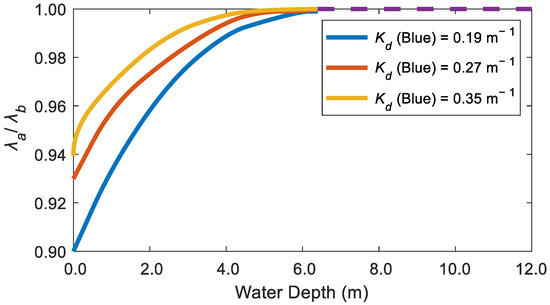 The ratio of the dominant wavelength of water after (λa) and before (λb) correction with the spatial method (with a 60-m tile size) against water depth from three locations. At depths > 6.4 m (purple dashed line), the dominant wavelength did not need correction.