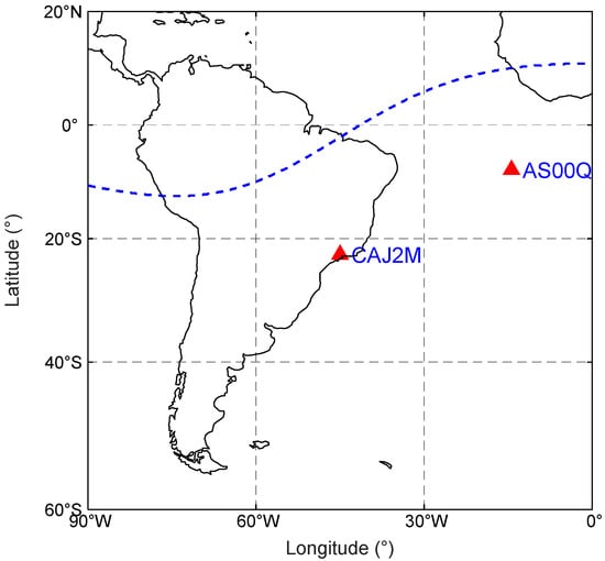 Distribution of ionosonde stations. The red triangles indicate the positions of ionosondes, and the blue dashed line marks the geomagnetic equator.