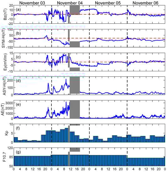 An intense geomagnetic storm occurred during 3–5 November 2021. Figure 2 shows the geospacer indices during 3–6 November: (a) IMF Bz component in Geocentric Solar Magnetospheric (GSM) coordinates; (b) symmetric ring current index (SYM-H); (c) east–west component of the interplanetary electric field (Ey) index; (d) asymmetric ring current (ASY-H) index; (e) Auroral electrojet (AE) index; (f) Kp index; (g) F10.7 index. Bz turned southward at about 20:30 UT on 3 November, and sudden storm commencement (SSC) occurred. SYM-H decreased from 21:00 UT on 3 November and reached its minimum of −117 nT on 4 November. Ey increased rapidly from 0 to 13 mV/m and oscillated with the Bz component. The two peaks in the ASY-H and AE indices around 22:00 UT on 3 November and 02:00 UT on 4 November coincided with downward SYM-H around those times. The subsequent long-time enhancement in the ASY-H and AE indices from ~04:00 UT to ~15:00 UT on 4 November suggests that there were strong partial ring current, PPEF, auroral activity, and joule heating, which might have induced equatorward neutral wind surges []. Kp increased from 4 to 6 and reached its maximum value of 7 at 12:45 UT on 4 November. The F10.7 index stayed at around 85 during 3–6 November.
