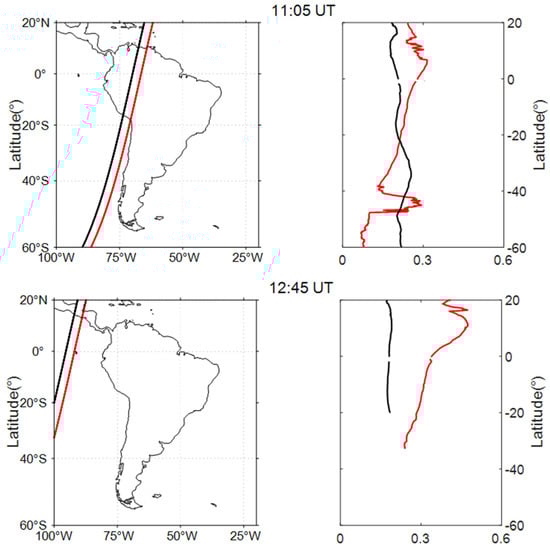 Figure 4 shows the satellite orbit of DMSP (left column) and in situ electron density comparison (right column) between the storm day and the quiet day close to 11:05 UT and 12:45 UT. The satellite orbit and electron density values on the storm day and the quiet day are presented by red lines and black lines, respectively. At 11:05 UT, DMSP F-17 passed the north and west coasts of the South American sector. The electron density values between [20°S, 20°N] on the storm day at 11:05 UT were larger than those on the quiet day. At 12:45 UT, DMSP F-17 passed the eastern Pacific Ocean. With the intensification of the positive ionospheric storm, the electron density enhancement became more prominent. The electron density values on the storm day increased to three times of quiet-day values at 10°N and were significantly larger than the values on the quiet day at other latitudes.