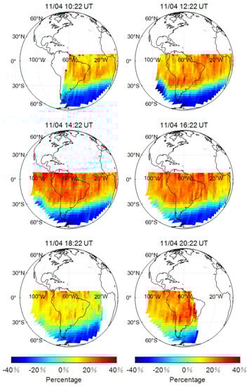 Figure 5 gives the relative difference in GOLD ∑O/N2 between the storm day and the quiet day from 10:22 UT to 20:22 UT. At 10:22 UT, there was ∑O/N2 depletion with the magnitude of ~40% at middle and high latitudes over the eastern part of South America and the Atlantic. At the same time, ∑O/N2 was enhanced at low latitudes and in the equatorial region at the magnitude of 30%. From 12:22 UT to 14:22 UT, GOLD ∑O/N2 observations covered the most of South America, and the magnitude of ∑O/N2 enhancement increased to ~50%. From 16:22 UT to 18:22UT, there were no obvious variations in the morphology of ∑O/N2 enhancement, but its magnitude decreased to ~20%. At 20:22 UT, GOLD ∑O/N2 observations covered the western part of South America, and the magnitude of ∑O/N2 enhancement between 30°S and 10°N was ~35%, which might have been correlated with other events.