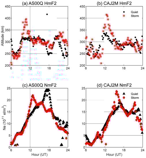 HmF2 and NmF2 comparisons between the storm day and the quiet day at AS00Q and CAJ2M ionosonde stations. In the top row, storm-day and quiet-day HmF2 values are marked by red asterisks and black dots, respectively. In the bottom row, storm-day and quiet-day NmF2 values are represented by red diamonds and black triangles, respectively.