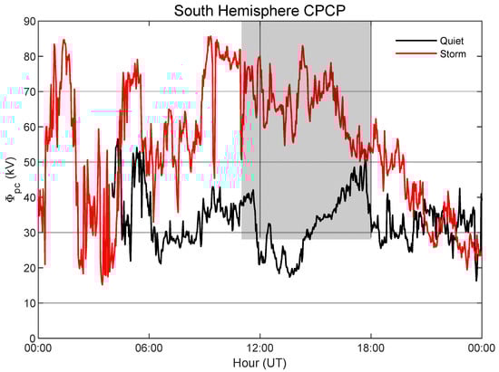 Cross-polar cap potential (CPCP) values at the South Pole as derived from SuperDARN. ΦPC on the quiet day and storm day are represented by black and red lines, respectively. The shaded area indicates the time period of the positive ionospheric storm.
