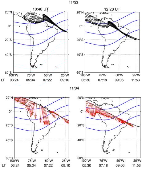 For further analyzing the uplift of HmF2, the storm-day horizontal and meridional ion drifts observed by the ICON satellite were compared with those on the quiet day. Figure 8 shows ICON ion horizontal velocity on the quiet day (3 November; black arrows) and storm day (4 November; red arrows) around 10:40 UT (left column) and 12:20 UT (right column). The magnetic equator and magnetic latitudes of 15° on both sides are indicated by blue lines. The second row of the X-axis denotes the local time at which the ICON satellite passed the longitudes in the first row of X-axis. At 10:40 UT (left column), the horizontal ion velocity on 3 November was southward, between 60 and 100°W (local time 03:24–07:10), and was induced by the equatorward neutral wind on the nightside. Due to the northward neutral wind from the summer hemisphere to winter hemisphere, the horizontal ion velocity between 25 and 60°W (local time 07:10–09:10) was generally northward. On 4 November, the southward horizontal ion velocity in the geomagnetic northern hemisphere was enhanced by the storm-induced equatorward neutral wind []. In the geomagnetic southern hemisphere, it was northwestward and southeastward between [−15, 0] and [−30, −15] magnetic latitude, respectively. At 12:20 UT (right column), the horizontal ion drift on 3 November was similar to that at 10:40 UT. However, the horizontal ion drift in the geomagnetic southern hemisphere on 4 November was southeastward and generally perpendicular to the magnetic equator.
