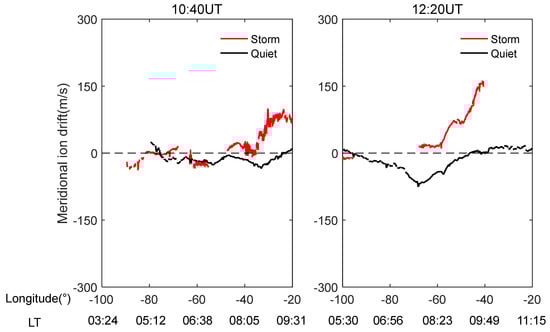 Comparison of ICON meridional ion drifts (within the geomagnetic meridional plane, perpendicular to the field line, positive outward) between the quiet day (3 November; black line) and storm day (4 November; red line). The second row of the X-axis denotes the local time at which the ICON satellite passed the longitudes in the first row of X-axis. The satellite trajectories are the same as those in Figure 8.