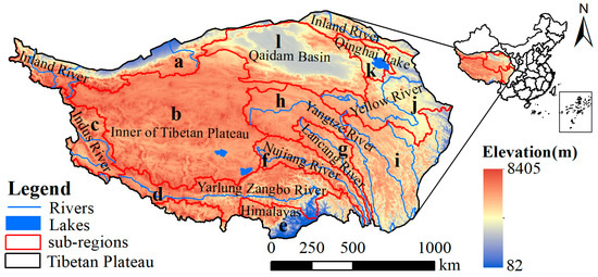 Tibetan Plateau, known as the “Asian Water Tower” and “the Third Pole” because of the abundant water resources and it having the highest elevation in the world, is the birthplace of more than a dozen water systems, and in which the rivers provide water resources for more than two billion Asian people, including the Chinese [7,8,9]. Both the “Climate change 2021: the physical science basis” assessment report [2] and the “Blue book on climate change in China 2021” [10] point out that the global temperatures and sea levels are still rising, the Arctic Sea ice area is reducing, and other issues also remain serious. The alpine regions are highly sensitive and prone to climate change, and the warming rates are twice as much as the global average [11]. Given the unique geographical location and climatic conditions, the ecosystem of the Tibetan Plateau is very fragile [12,13]. In the context of the warming climate, permafrost degradation, permanent glacier and snow melting, lake expansion and other phenomena happening on the Tibetan Plateau have significantly transformed its hydrological processes [14] and posed severe challenges to local, ecological, environmental protection and water resources management. Understanding how climate change affects the plateau’s ecosystem and how both vegetation and climate changes impact on the spatial heterogeneity of water resources that are stored in a gaseous, liquid, and solid state over the Tibetan Plateau are crucial for water security and Asian life.