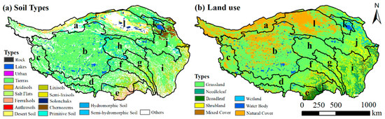 Spatial distributions of soil and land use types over the Tibetan Plateau.