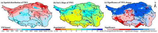 The spatial distribution and its changing trend in the TWS over the Tibetan Plateau during the period 1981–2015 are demonstrated in Figure 3 and Figure 4. The multi-year average TWS overall increased from north to south across the Tibetan Plateau (Figure 3a), in which the minimum value of 256 mm was distributed in the northeast Qinghai Lake region (k) and the surroundings of the Qilian Mountains, while the maximum reached 52,236 mm around Mount Everest. In more than 90% of the total Tibetan Plateau, the TWS was between 300 and 600 mm. Only about 0.6% of the Tibetan Plateau produced TWS above 800 mm, which was mostly distributed near the southern Himalayas (e). The TWS in the northern Tibetan Plateau, such as the Inland River region (a), Qaidam Basin (l), Qinghai Lake region (k), the source and partly upper regions of the Yellow River (j), and Yangtze River (h), were relatively low and mainly ranged below 500 mm. Especially for the Qilian Mountains and the Qinghai Lake region (k) in the northeastern plateau, the TWS was less than 300 mm, whereas in the southern Tibetan Plateau, including the basins of the Indus River (c), Yarlung Zangbo River (d), Nujiang River (f), Lancang River (g), and the Inner of Plateau (b), the TWS was more than 500 mm. The regions with extremely high TWS were mainly located in the mountain area, where they are covered by snow and glaciers and the value could exceed 50,000 mm.
