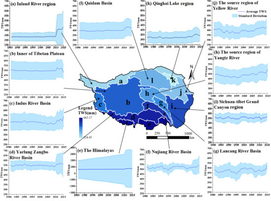 The value of the annual TWS and its standard deviation for each sub-region during the period 1981–2015 were extracted and the multi-year average TWS was also calculated. The spatial distribution of multi-year average TWS was shown in the center of Figure 4, which ranged from 324.45 mm of the Qinghai Lake region (k) to 663.17 mm in the Himalayas (e). The outer circle was the long-term trend lines of the TWS in 12 sub-regions from 1981 to 2015. From the figure it can found that the standard deviation of the TWS in the Inland River region (a) was less than 50 mm before 2010, the TWS was maintained at about 325 mm, and the volatility was low. In addition, then there was a sharp increase from 2010 to 2011, and the volatility increased accordingly. The TWS in the Qiang-tang Plateau (b), Qaidam Basin (l), Yarlung Zangbo River Basin (d), and Qinghai Lake region (k) firstly rose and then showed different degrees of decline from 2010 to 2015. While for the Indus River Basin (c), the Yangtze River (h), and Yellow River (j) source regions, and the Nujiang River (f) and the Lancang River (g) basins, the TWS firstly decreased and then increased during the period 1981–2015, and the high value ultimately emerged in 2015. The standard deviation of the TWS can reach more than 1000 mm around the Himalayas due to the large base and the melting of snow and glaciers.