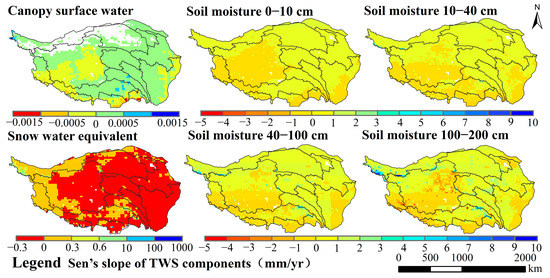 Spatial distributions of the trends in the terrestrial water storage components over the Tibetan Plateau.
