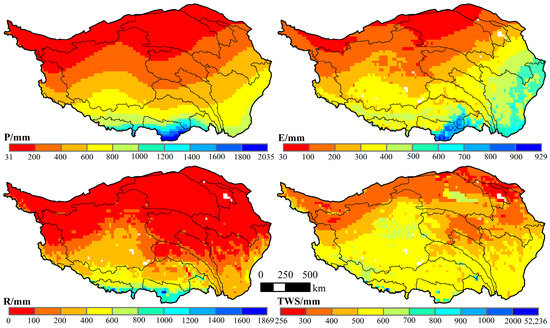Spatial distributions of hydrological cycle’s elements and terrestrial water storage changes over the Tibetan Plateau.