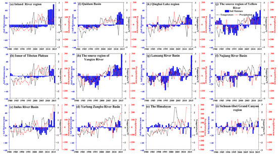 The influences of climate change on soil moisture were also analyzed at an interannual scale. The annual temperature, precipitation, and soil moisture were jointly compared in the 12 sub-regions from 1981 to 2015 (Figure 11), and the changing trend of each element was expressed obviously through the calculated anomalies. In the Inland River region (a), Qaidam Basin (l), and Qinghai Lake region (k), soil moisture and precipitation showed a basically consistent trend, which was both precipitation and soil moisture continuing to rise during the period 1981–2015, and the average value after 2000 was significantly higher than that before 2000. The Yangtze River (h) and Yellow River (j) source regions, Nujiang River Basin (f), and Lancang River Basin (g) belong to the monsoon climate region, where the relationships between precipitation and soil moisture were very consistent, negative anomalies in soil moisture were often accompanied by lower temperature and precipitation than the multi-year average values, and vice versa. In the Qiang-tang Plateau (b), Indus River Basin (c), and the Himalayas (e), as the temperature increased, the precipitation increased, and the soil moisture decrease may be due to the topographic and vegetation conditions.